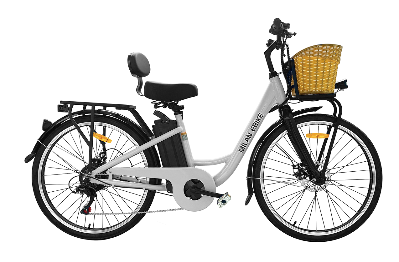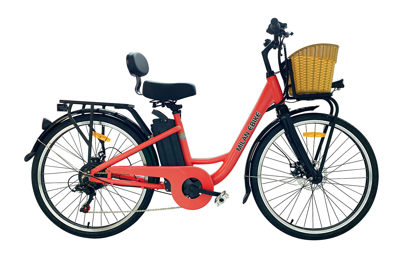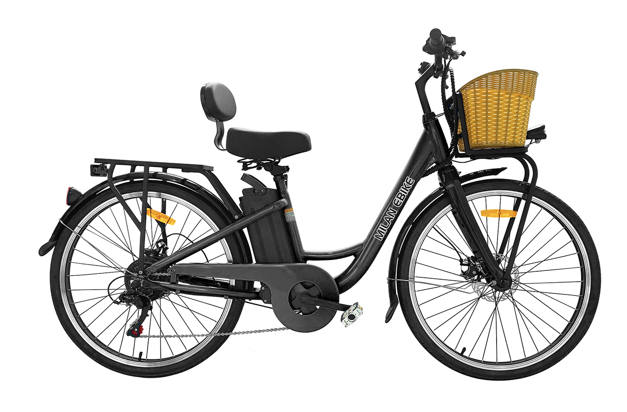The Milan is our newest product, and comes complete with some new and innovative features. The smooth and sleek ride is augmented with new features including a rear seat support for added comfort. It is also designed with storage in mind- as it comes with a weight bearing rear mount, as well as a front basket with 1235 cubic inches of storage. With a removable 48V 10AMP Lithium Ion battery that is good for up to 1,000 charges, the Milan is built for power, durability and function. The Milan can charge both in or outdoors, and it’s step-through frame allows for easier mounting access. Built for comfort and efficiency, you’ll love every mile on the Milan.