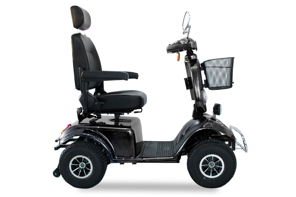 This 4 wheeled scooter is stylish and sturdy. With extra stability and great maneuverability it's great for both indoors and outdoors. Comfort features include: Easy operation, fashionable design, Comfortable Deluxe Captain's style seat, 330lbs user weight capacity, sturdy and stylish steel tubing, Dual-direction rotation seat, Quick release tiller angle adjustment, Height & width adjustable flip-up armrests, adjustable headrest height. Comes standard with anti tippers and large carry basket. Offers good performance on indoor and smooth outdoor surfaces. Rear-wheel drive and compact size provide optimum maneuverability and accessibility.